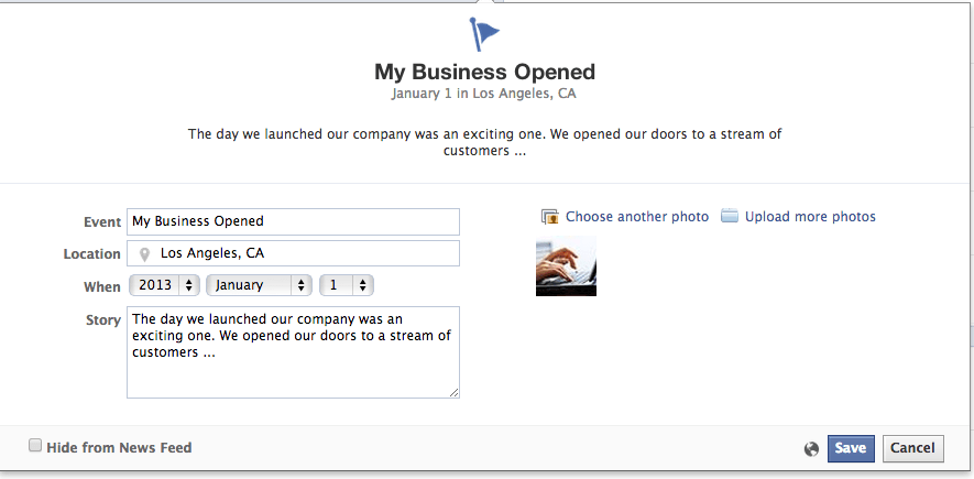 When many Facebook business pages were created, page admins started posting status updates right away, bypassing options to create a unique history, or story, on your page’s Timeline. Status updates do this to some degree, but by using Milestones, you can create a unique and specific story that will be listed in your About section.